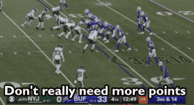 The division had been locked up weeks ago, but with possible seeding implications on the line the Bills had to be prepared for the lowly New York Jets. An easy game to look past based on opponent and time of year, Buffalo elected to flex their muscles.