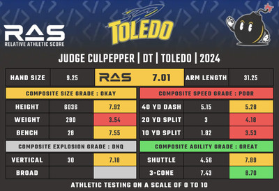 After a 6-year college career, Culpepper declared for the NFL Draft and was invited to the Hula Bowl in Orlando, where he registered 2.5 tackles and a quarterback hurry in the annual exhibition. In the spring, he took another step toward the draft process by participating in Toledo’s Pro Day on March 19. Kent Lee Platte, the creator of the metric Relative Athletic Score (RAS), rated Culpepper a 7.01 out of 10 based on his Pro Day measurements compared to other defensive tackles.