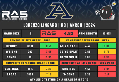 Lingard is a former five-star caliber prospect who was unable to latch on at Florida due to depth and injury. Part of an aggressive re-structuring of the RB room in 2023, Lingard was expected to be a workhorse back for the Zips. Lingard showed flashes of what made him such an intriguing prospect coming out of high school, with 1,000+ combined yards (641 rushing, 368 yards receiving) and six total touchdowns (four rushing, two receiving) during the 2023 campaign.