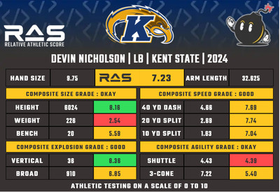 Nicholson offers plenty of experience. Before his brief stint at Kent State, he was a contributor at Missouri, compiling 152 tackles and nine tackles for loss. Injuries derailed his senior season at Kent State, but Nichols made an impact when he was on the field. In nine games, he made 53 tackles with 4.5 of those occurring behind the line of scrimmage. He is undersized, but can immediately make an impact as a special teamer.