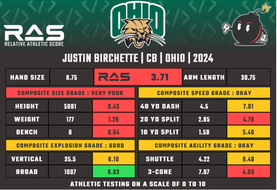Despite his small five-foot-eight, 177-lb frame, Justin Birchette is an exceptional ball hawk. Birchette broke up 22 passes in his Ohio career, including nine last season on a defense that allowed 15 points per game. Birchette may be undersized, but other undersized corners have thrived in the NFL, such as Brent Grimes.