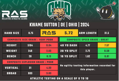 Kwame Sutton is a defensive end that always requires the attention of offensive linemen. In his career at Ohio and Austin Peay, Sutton had 22.5 TFLs and 12 sacks. However, like several of his Bobcat counterparts, he is undersized with a 5’11” 249-lb frame. Also like several of his Bobcat counterparts, Sutton has natural pass rush skills that will help him at the next level.
