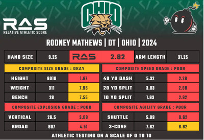 At 311 pounds, Rodney Mathews brings phenomenal size to an interior defensive line. Mathews was disruptive in his Ohio career, finishing with 71 career tackles and 14.5 TFLs, including seven in 2022. Mathews could contribute immediately in either a 3-4 or 4-3 scheme.