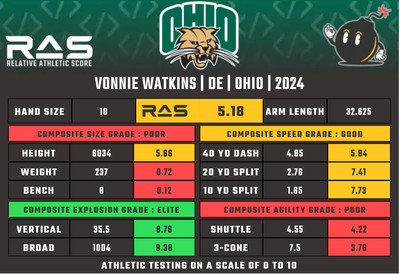 Vonnie Watkins wreaked havoc up the middle for Ohio the past two seasons, with 22 tackles-for-loss and 9.5 sacks, including 14 TFLs in 2022. Watkins could find his start on special teams, but his pass rush ability is promising.